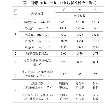 由表3可知,球磨20h、35h片狀銀粉制得IC封裝導(dǎo)電銀膠點膠效果好,無明顯拉膠現(xiàn)象;45h的制得導(dǎo)電銀漿點膠存在尖頭和拉膠現(xiàn)象。同時可以看出,20h的片狀銀粉觸變指數(shù)低,導(dǎo)電銀膠需要有良好觸變特性便于點膠;45h的片狀銀粉觸變指數(shù)高;而且可以看出35h、45h制得的導(dǎo)電膠的線條電阻值較小。這三款產(chǎn)品推力測試、固化后硬度測試、高低溫冷熱沖擊測試及高溫高濕測試均滿足應(yīng)用。綜合上述各項指標(biāo),球磨35h制得的片狀銀粉制得的導(dǎo)電銀膠均達(dá)到了應(yīng)用指標(biāo)要求。