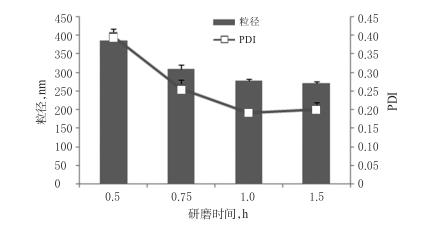 2.1.3研磨時間的篩選稱取BRE原料藥7.5g,置于含有吐溫80(1.125g)的水溶液(22.5mL)中,攪拌混懸,加入氧化鋯珠(粒徑為0.6mm)450g,分別研磨0.5、0.75、1.0、1.5h,制備3批BRE納米晶混懸液。以BRE納米晶混懸液的粒徑、PDI為指標(biāo),篩選研磨時間。結(jié)果,隨著研磨時間的延長,BRE納米晶混懸液的粒徑、PDI逐漸減??;研磨0.5、0.75、1.0h時,BRE納米晶混懸液的粒徑、PDI減小的幅度較大;研磨1.5h時,BRE納米晶混懸液粒徑雖然較研磨1.0h時的粒徑減小,但減小幅度不大。綜合考慮能耗和時間,確定研磨時間為1h。研磨時間的篩選結(jié)果見圖3。